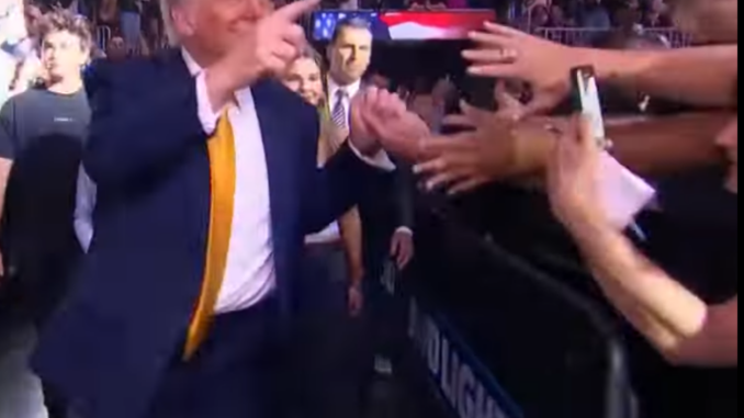 Daß eine derartige Stimmung in den USA für Trump nicht ein Missgriff eines Meinungsforschungsinstituts ist, sondern die breite Stimmung der US-Amerikaner widerspiegelt, zeigte sich am 12.4. beim Einzug von Donald Trump zu den MMA-End-Kämpfen in Miami.